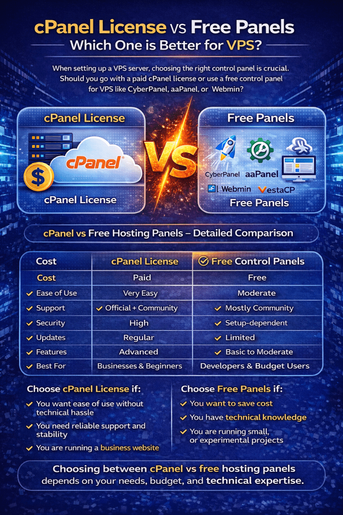 Choosing between cPanel license vs free panels depends on your budget, technical expertise, and business requirements.